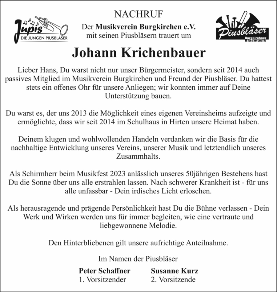 Die Burgkirchner Blasmusik St .Pius wird durch diesen Förderverein ihre mittlerweile 50-jährige Geschichte fortschreiben um weiterhin ein fester Bestandteil des kulturellen Geschehens auf Gemeinde-