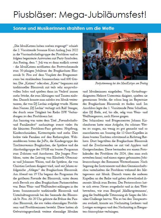 Im Rückblick auf das vergangene Vereinsjahr gab es viele Höhepunkte. Als Festmusik durfte man am 125-jährigen Jubiläum der Freiwilligen Feuerwehr Burgkirchen teilnehmen. Hohen Stellenwert und Bedeutung hatte das Sommernachtskonzert auf dem Rathausplatz Burgkirchen. Zusammen mit den St. Martinsbläsern aus Halsbach durften zahlreiche Gäste einen stimmungsvollen Abend in der „guten Stube Burgkirchens“ erleben. Eine besondere Ehre war es für Piusbläser und Martinsbläser zugleich, ihren Gründer und ersten Dirigenten, Helmut Unterstein begrüßen zu dürfen. Und auch die Freunde aus Wingen kamen mit einer Backstation für Flammkuchen angereist. Im Herbst folgte ein Ausflug zur Stoißeralm mit musikalischem Frühschoppen. Erstmals fand das Jahreskonzert an zweimal statt und zwar am Samstagabend und Sonntagnachmittag. Die große Zuhörerschar an beiden Terminen hat die Erwartungen bei weitem übertroffen; daher wird der Ablauf in dieser Form auch beibehalten. Als i-Tüpfelchen kam an diesem Wochenende noch der Gewinn beim Sparkassenvoting dazu. Mit vereinten Kräften gelang es der Burgkirchner Blasmusik die meisten Stimmen zu erreichen und damit 5.000 Euro für die Jugendarbeit zu gewinnen. Die lustigste Veranstaltung war mal wieder das allseits beliebte Faschingsbrettl im Bürgerhaus. Gemeinsam mit vielen Mitwirkenden – unter anderem der Gruppe Bandersnatch aus Wingen - haben die Piusbläser und ihre Freunde wieder mal einen, wenn nicht den Höhepunkt des Burgkirchner Faschings gestaltet.